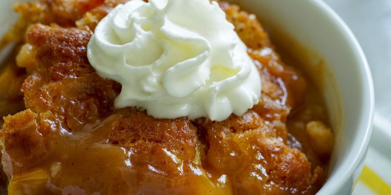 Pentru topping, amestecă apa, zahărul, untul și nucșoara într-o cratiță. Lasă să fiarbă, amestecă până când se dizolvă zahărul. Toarnă peste amestecul cu piersici. Lasă la copt până umplutura începe să bolborosească sau trece testul scobitorii. Asta înseamnă cam 40 de minute. Servește caldă sau rece cu frișcă.