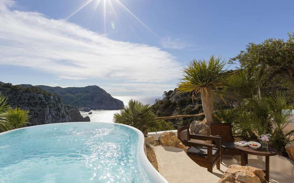 Acest loc retras oferă cele mai spectaculoase vederi mediteranieene din Ibiza. Amplasat într-o pădure de pin, pe marginea unei stânci dramatice, care coboară în mare, hotelul se bucură de avantajul unui lux liniștit și de o priveliște uimitoare spre mare. Toate cele 77 de camere dispun de balcoane și terase mobilate, cu geamuri care pornesc din podea și duc până în tavan. În camerele Eden vei găsi terase cu podea moale, șezlonguri, scaune de răchită sau chiar piscine sub aer liber.