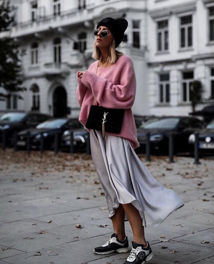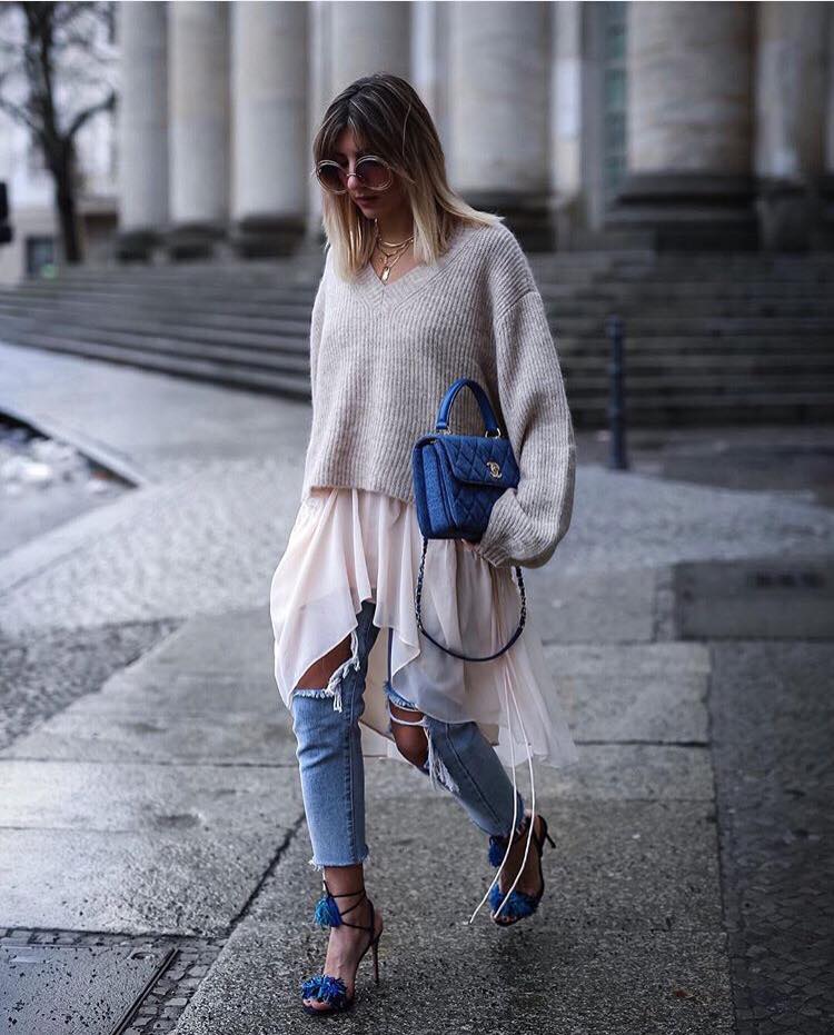Articolele care la prima vedere ți se par nepotrivite într-un outfit – o rochie din șifon, un pulover din lână și o pereche de blugi largi – pot crea un look feminin și în același timp confortabil în fiecare zi.