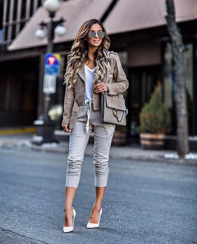 O alegere pentru curajoase: pantaloni sport, un top îndrăzneț, pantofi cu toc și o geacă din piele întoarsă. Mai ales că marile case de modă, celebritățile și fashion bloggerii adoptă acest outfit casual. Poate e timpul să-l încerci și tu?