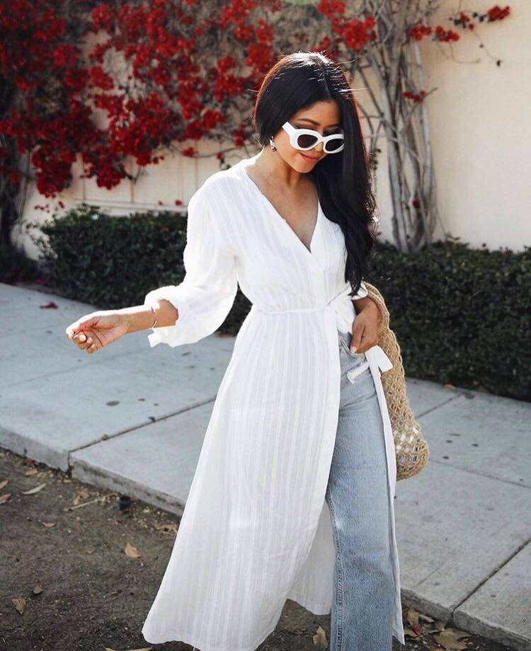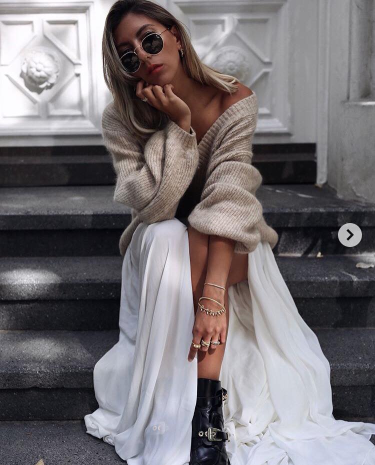 O combinație feminină și confortabilă – rochia de vară și un pulover lung. Crează un contrast și completează ținuta cu o pereche de botine sau chiar cu niște adidași.