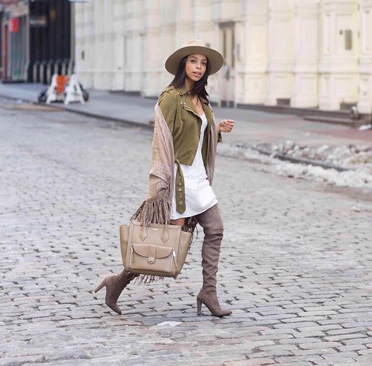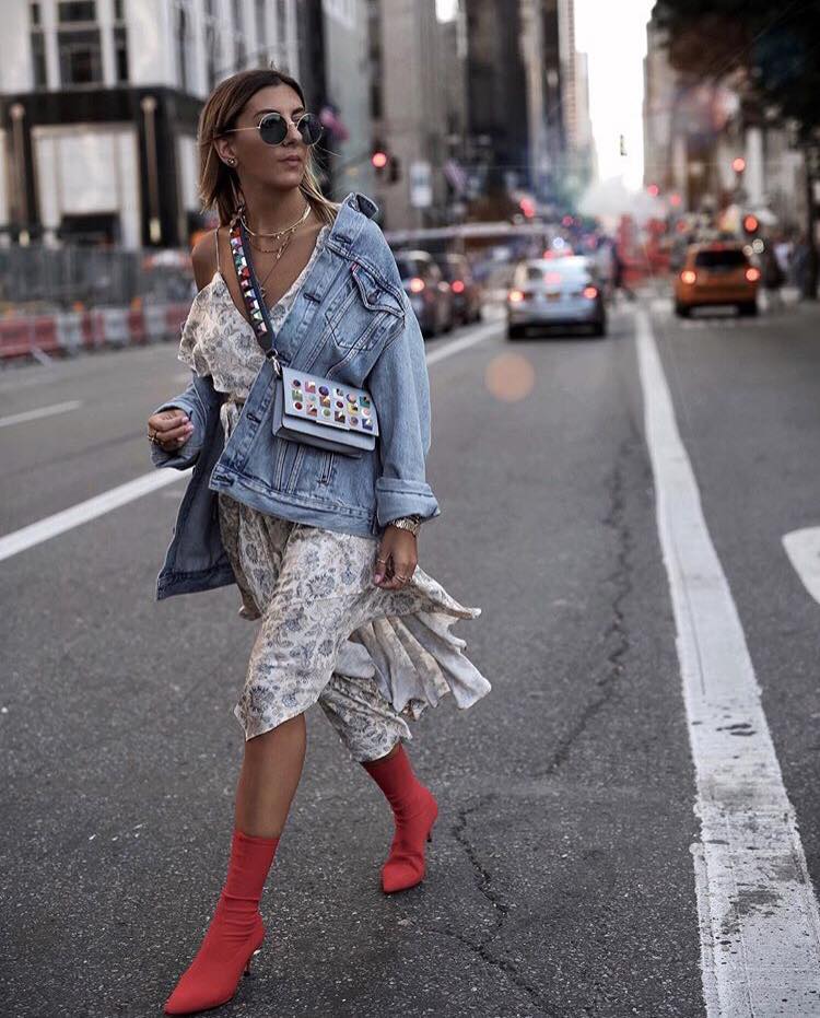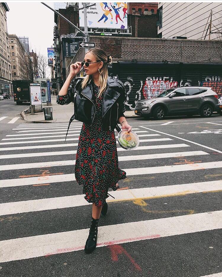 Una dintre cele mai populare combinații de articole vestimentare: o rochie de vară și o geacă. Este de preferat ca la această ținută să fie adăugate și o perece de cizme din piele întoarsă, așa nu doar că vă vor ține de cald, dar vă vor face picioarele mai subțiri vizual.