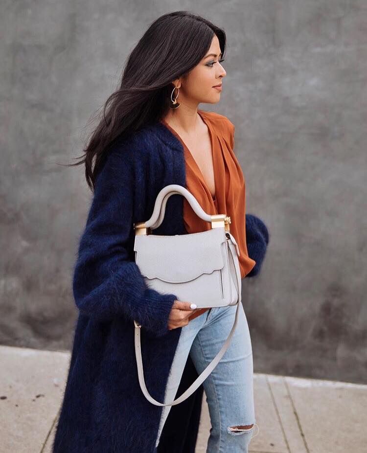 Bluzele din mătase au rămas în tendințe și rămân a fi populare și în sezoanele reci, combinându-se perfect cu cardiganele pufoase.