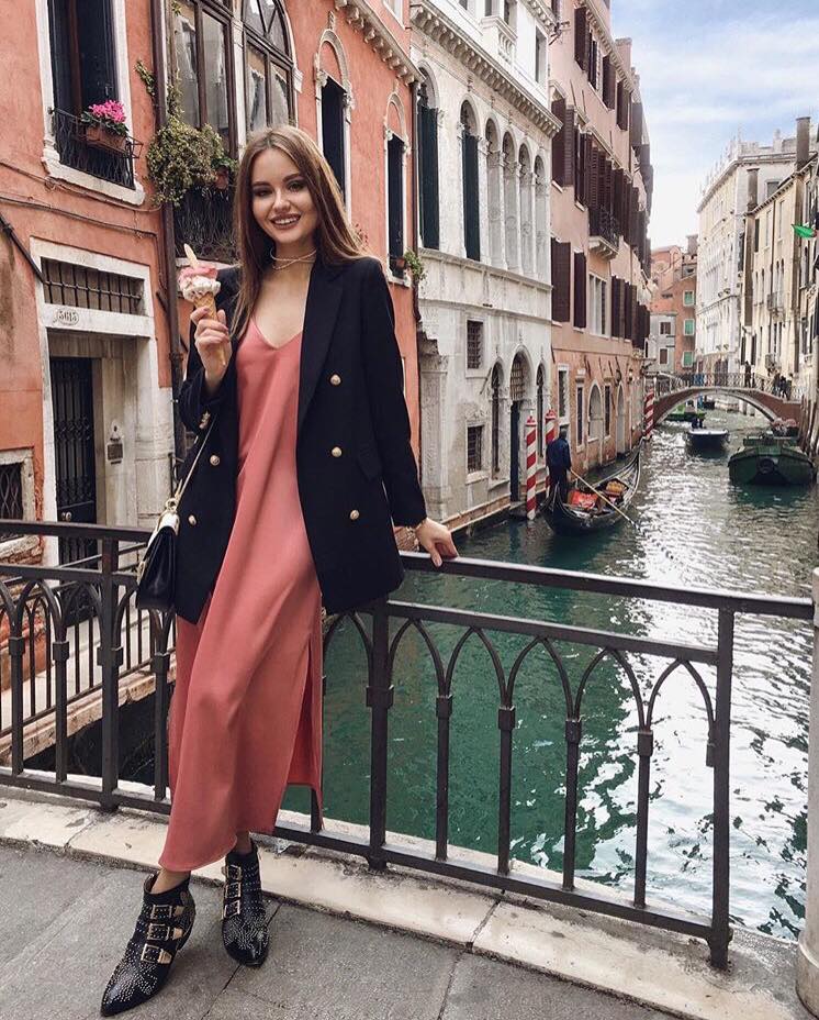 O rochie ușoară și un sacou clasic – o combinație care te va scoate tot timpul în evidență. Mai mult, rămâne a fi un outfit care nu se va demoda prea ușor.