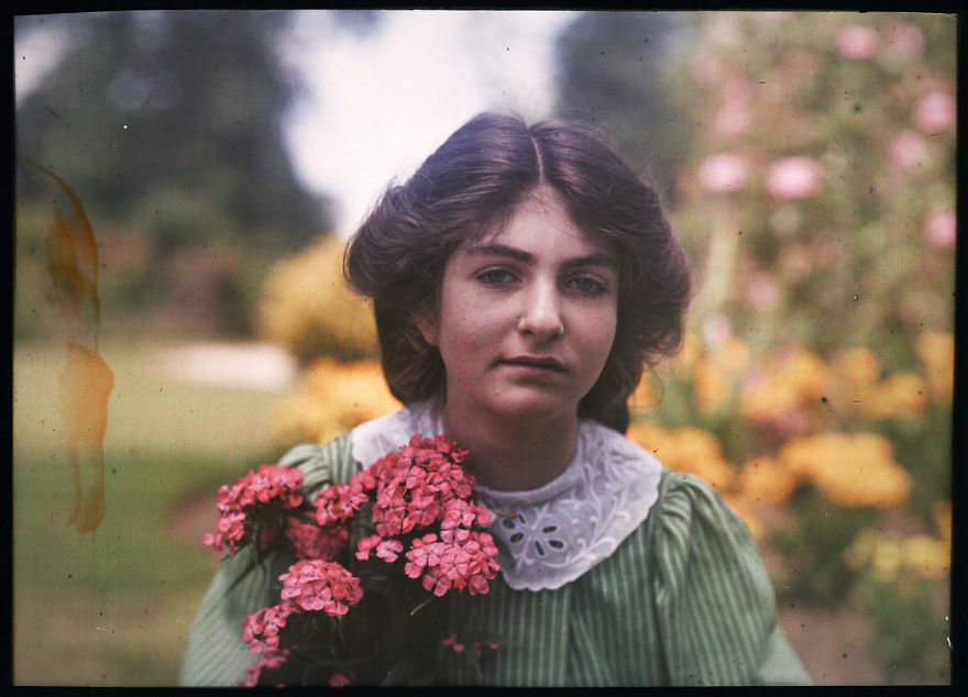 Autocromă a fiicei Etheldredei Janet Laing îngrădină, cu un buchet de flori roz, 1908