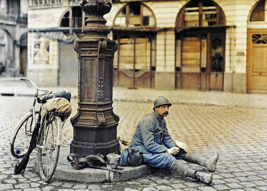 Prânz al unui soldat francez în fața unei biblioteci distruse, 1 aprilie 1917