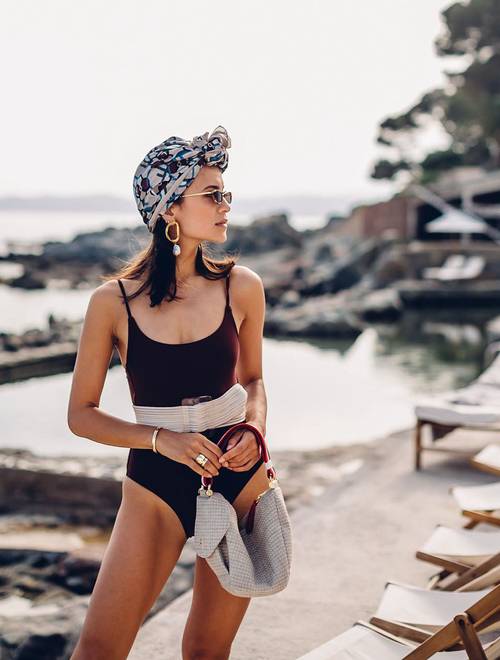 Costumele de baie cu centură sunt în mare trend în acest an. Poți recrea acest look cu costumul de baie favorit peste care pui o centură. Ar fi bine să fie o culoare contrastantă. Apoi, ce-ai zice de o eșarfă cu model și o pereche de cercei cu perle.